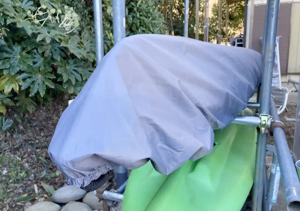 - 基礎は単管パイプ用ブロックを使用し、地面に軽く埋めただけ