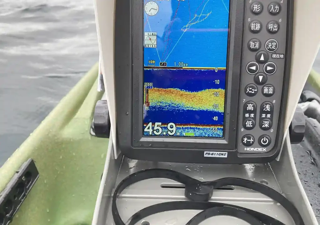 少し沖のポイントまでパドルを漕いで進むと、魚探には真っ赤に映る濃いベイト反応が。